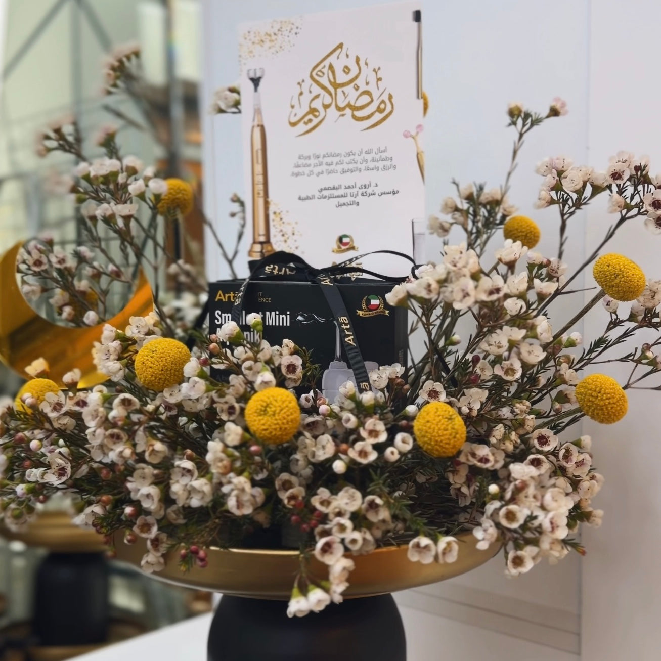 Presented in a sophisticated black-and-gold palette, the arrangement brings together: